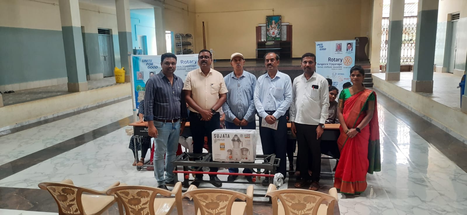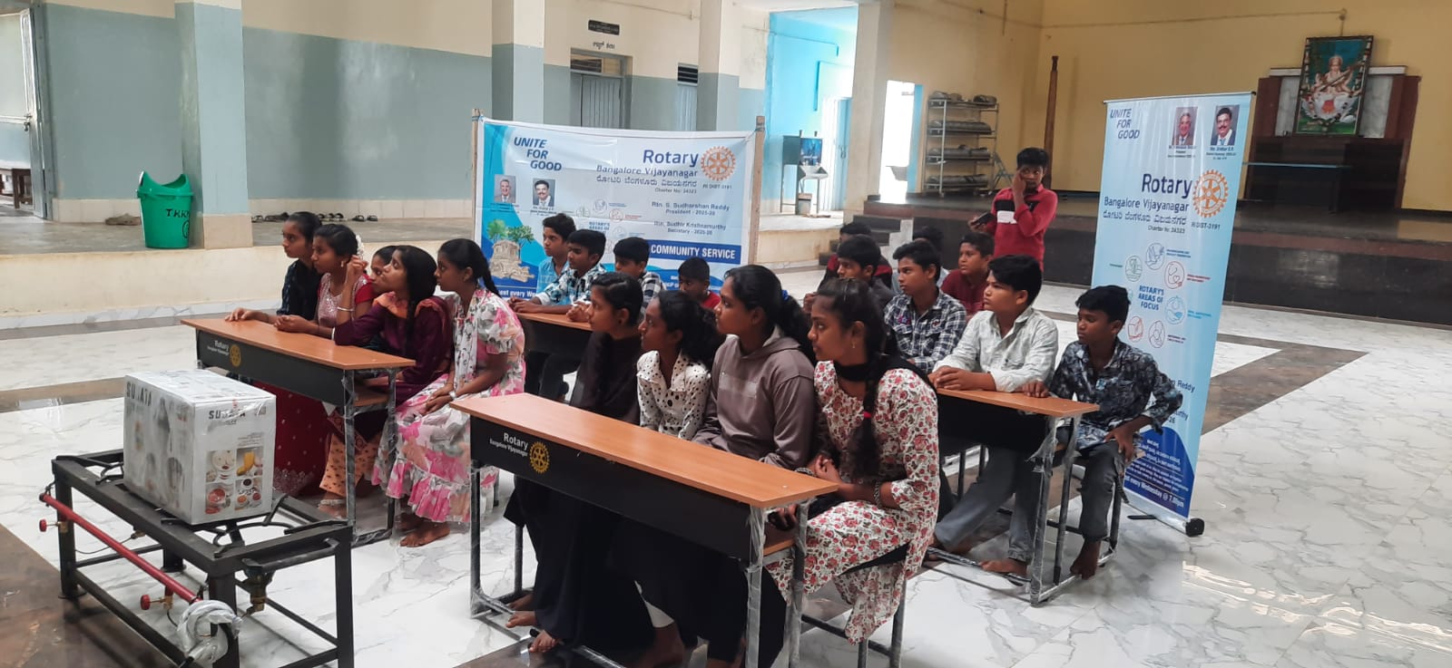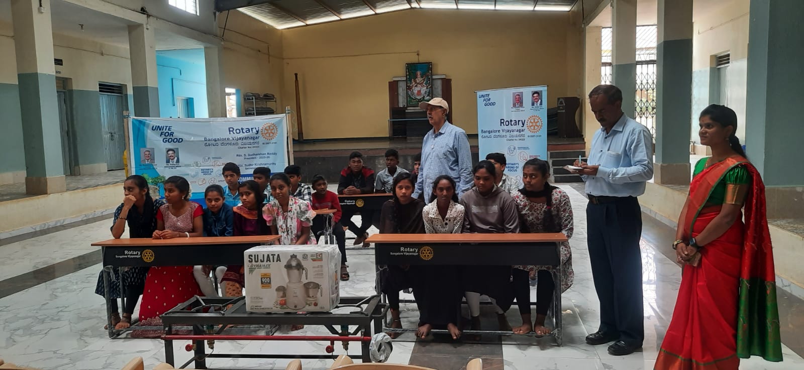 On September 10th, 2025, Rotary Bangalore Vijayanagar visited Thyamgondlu Government School, near Nelamangala and donated 5 wooden desks to be used in school classrooms and kitchen equipment such as Gas Stove and Mixer. The beneficiary are 140 students. This was led by President Rtn. Sudarshan Reddy, Secretary Rtn. Sudhir K and CSD Rtn. Ashok Mahadevan This initiative is part of Rotary’s ongoing efforts to support youth welfare and education in the community.