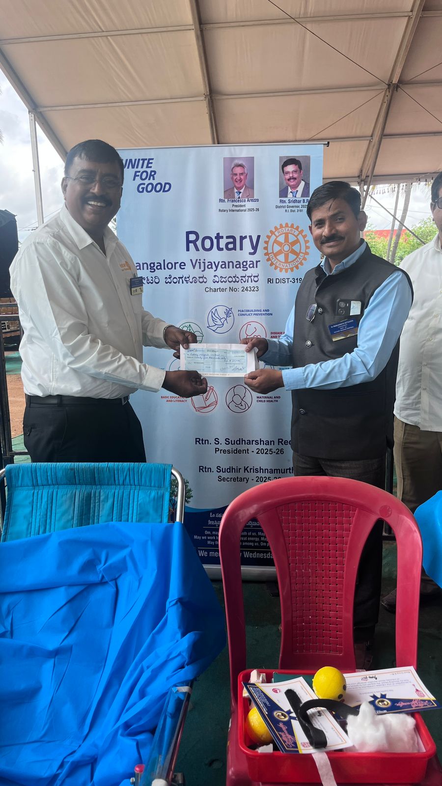 On September 4th, 2025, Rotary Bangalore Vijayanagar in association with Rotary Magadi Central organised a Mega Health Camp at Kempegowda Fort Grounds, Magadi Town. The health camp was conducted by BGS Global Hospital. A total of 520 patients were screened and treated for different ailments, 162 spectacles were distributed (spectacles were sponsored by RBV), a total of 60 unit's of blood was collected. Secretary Rtn. Sudhir K donated his blood. President Rtn. Sudarshan Reddy, Rtn. Lalitha, YSD Rtn. Vishwakumar, Past President Rtn. Krishnamurthy, Secretary Rtn. Sudhir, Past President Rtn. Ravindra, Vice President Rtn. Vivekananda and Ann. Niveditha attended the health camp. This initiative is part of Rotary’s ongoing efforts to support general public health and welfare in the community by organising free health check-ups, consultations & health awareness sessions.