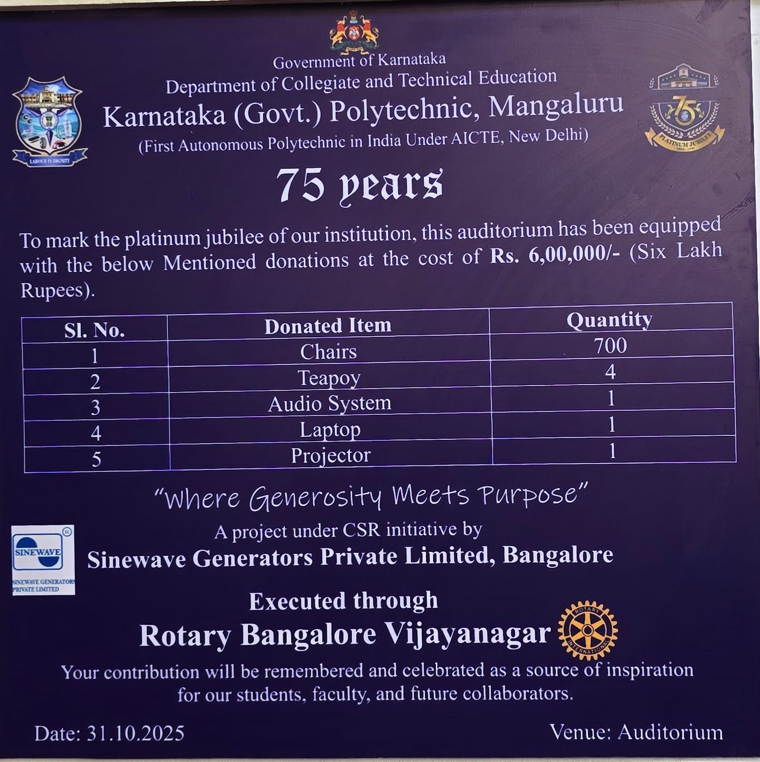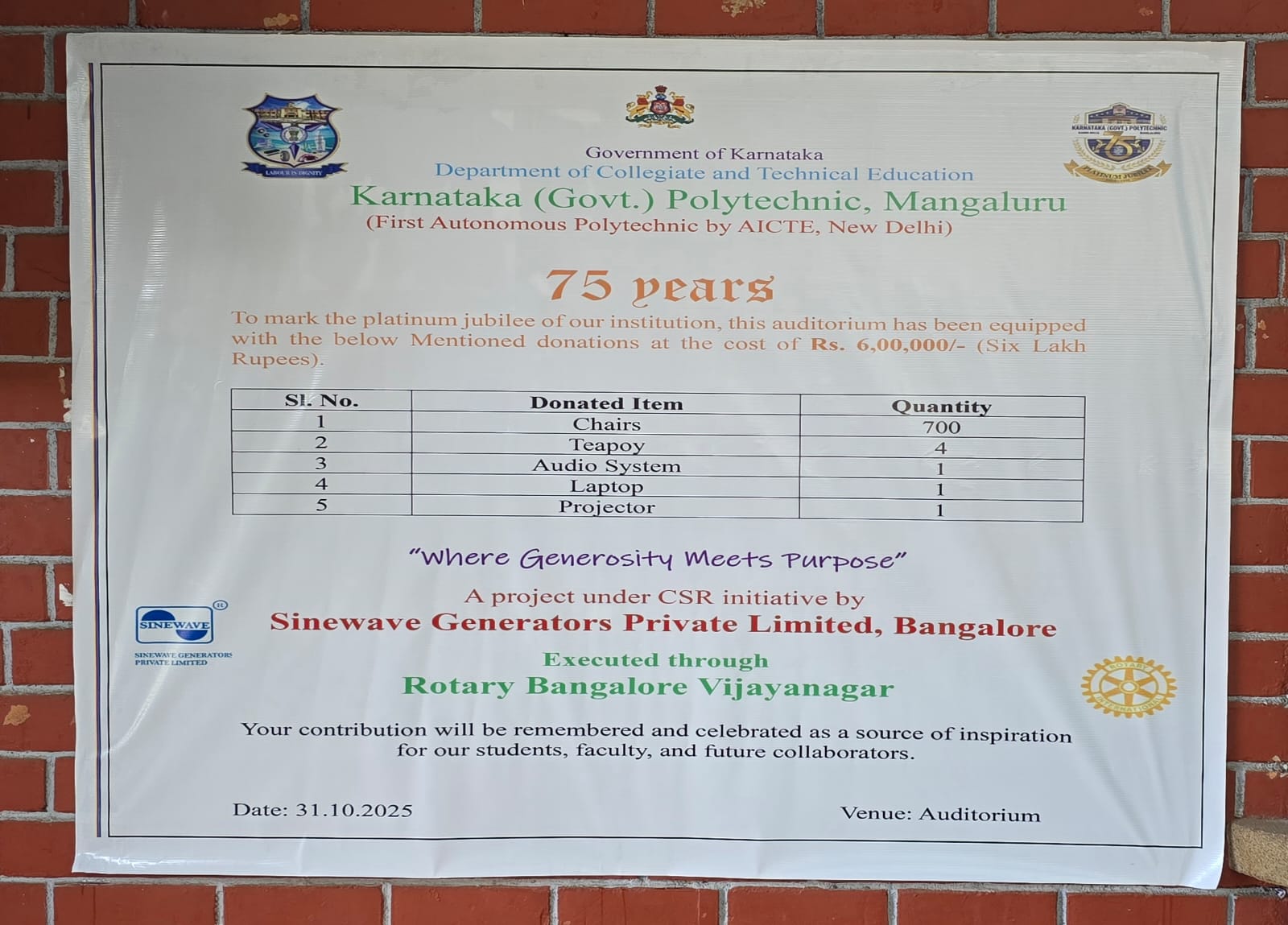 On 31st October, Rotary Bangalore Vijayanagar, with the generous support of CSR partner Sine Wave Generators, inaugurated the donation of auditorium equipment, chairs, and a computer lab at Karnataka’s Polytechnic, Mangalore. Karnataka Polytechnic, Mangalore is a Government Polytechnic, which provides quality training to eligible students and prepares them as good technicians to suit the needs of industry, services and self employment, be innovative and succeed as good citizens. The programme was attended by a large number of Rotarians.